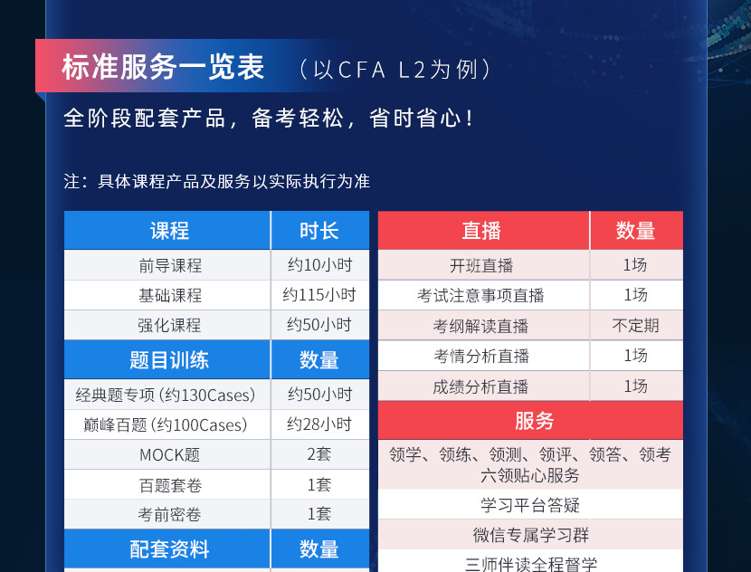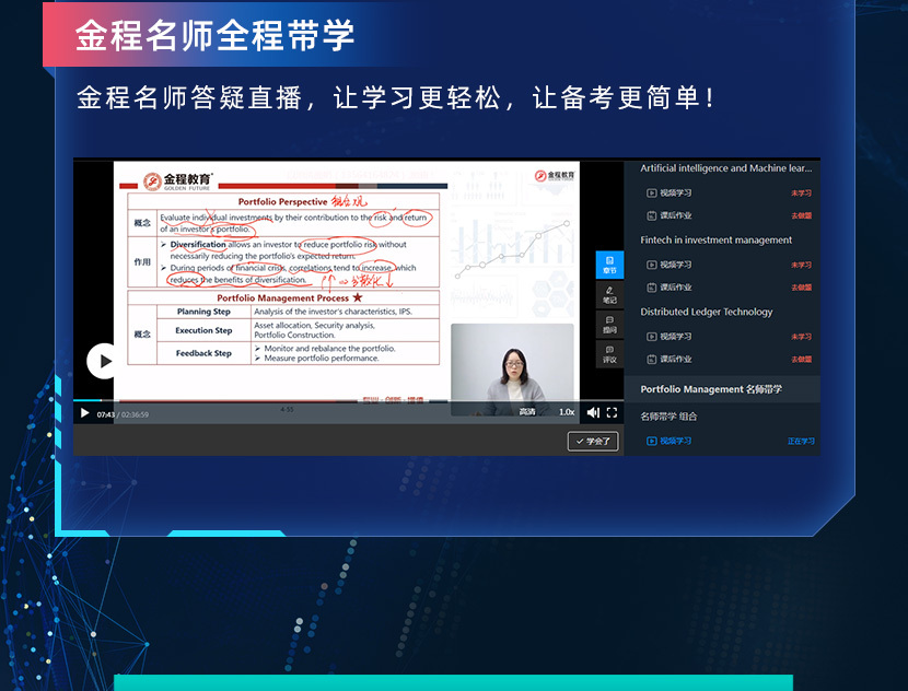 CFA智能通关计划课程将学习素材与人工智能完美结合,为学员通过CFA考试保驾护航;金程研究院呕心沥血,倾情打造;小班制管理,班主任督学,助教在线答疑,助力学员通过CFA。