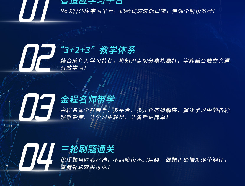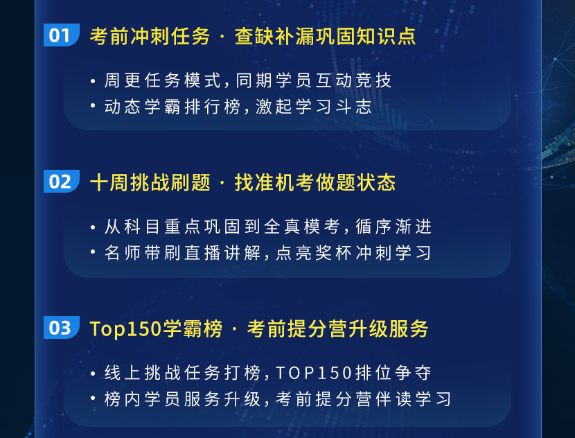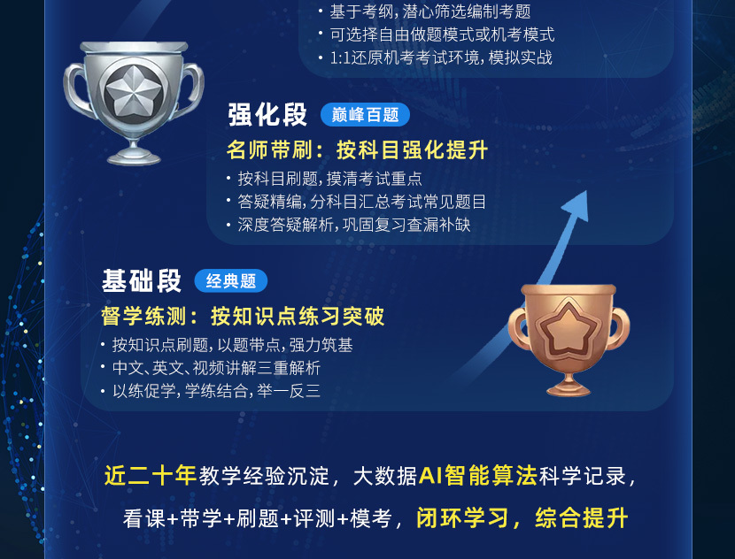适合需要系统学习、打牢基础的学员。包含前导+基础+强化+冲刺4个学习阶段,经典题+百题2大专项训练,考前提供1套密卷和2套模考。