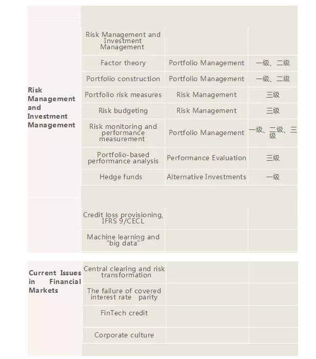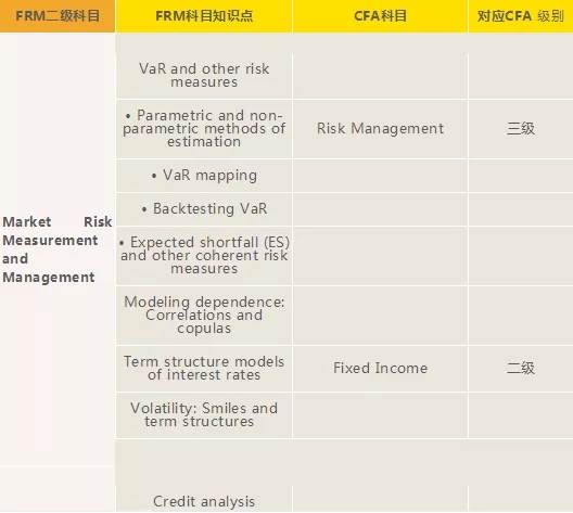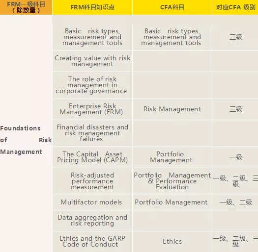 接下来分析的知识点不那么直观,且分散在各个学科中,由于FRM的学科数比CFA少,所以我们将FRM每门科目展开,去对应CFA知识主体的考点。