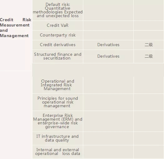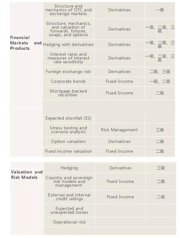 FRM分为两个级别,九门学科(表格右边)。其中一级包含前四门学科:Foundations of Risk Management ,Quantitative Analysis,Financial Markets and Products ,Valuation and Risk Models。剩余五门为二级学科。