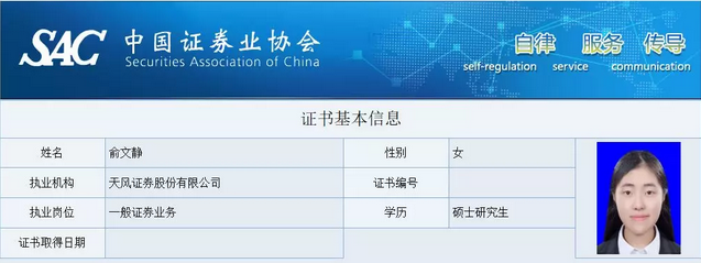据了解,此人名叫俞文静,中国证券业协会官网上显示,其目前就职于天风证券,学历为硕士。