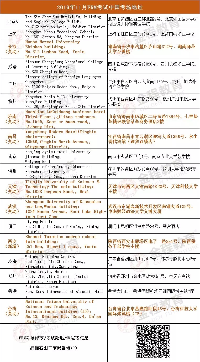 请注意!2019年11月FRM考试5个考点地址有变动